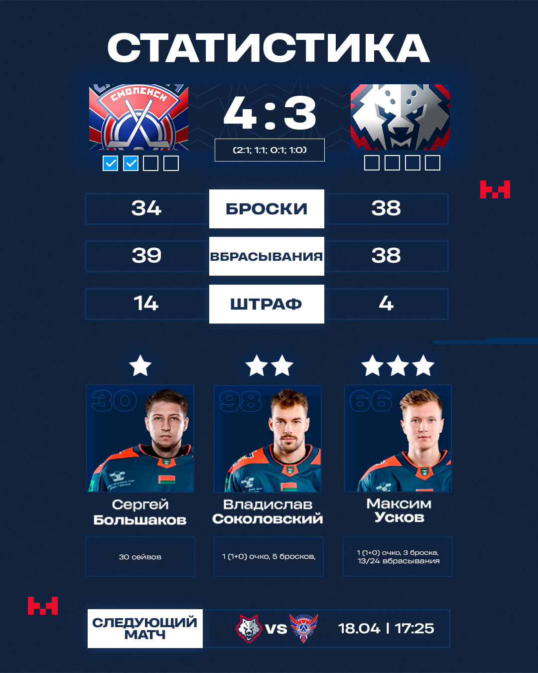 Серия переезжает в Жлобин при счете 2-0 в пользу смоленской команды. Домашняя площадка и родные болельщики уже неоднократно помогали «волкам» переламывать даже самые сложные противостояния, и в этом такая возможность тоже есть. Третья игра пройдет в ледовом дворце «Металлург» в ближайшую субботу 18 апреля. Начало – в 17:25.