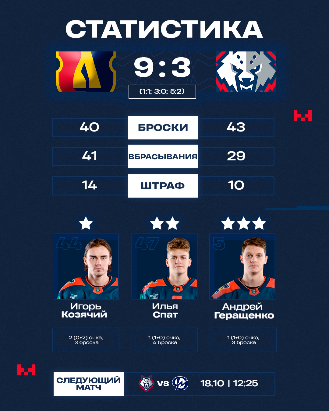 | ШАЙБЫ: | 1:0 – 15:03 Шумский (Ремезов, Кунишников). 1:1 – 18:08 Спат (Волченков, Козячий). 2:1 – 31:13 Шумский (Ремезов, Кунишников). 3:1 – 33:23 Ершов (Кунишников), ГБ. 4:1 – 37:24 С. Герасимов (Онуфриюк). 5:1 – 42:45 Пархомчик (Макаревич). 6:1 – 47:13 Онуфриюк (С. Герасимов, Карпов), ГБ. 6:2 – 48:30 Усков (Козячий, Стефанович). 7:2 – 51:36 Чубуков, ГМ ПВ. 7:3 – 52:53 Геращенко (Шевченко), ГБ. 8:3 – 56:53 С. Герасимов (Боярчук, Ершов), ПВ. 9:3 – 59:20 Пархомчик (Никитин), ГМ. |